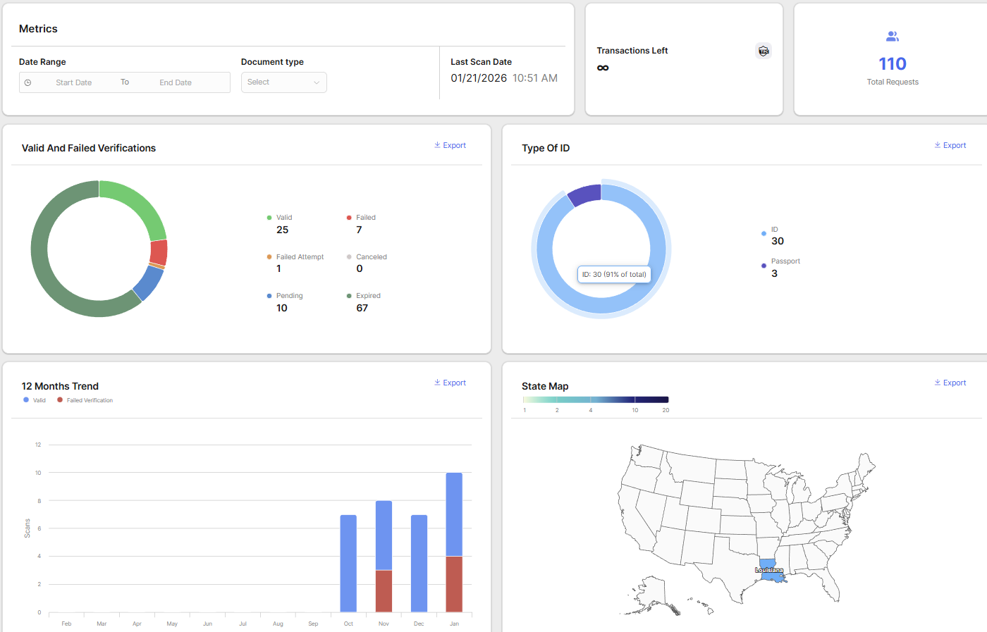 The Statistics section of the DIVE Online Web Portal provides insights into the performance and usage of your DIVE Online integration. This section includes various charts and graphs that help you analyze key metrics related to your identity verification processes.